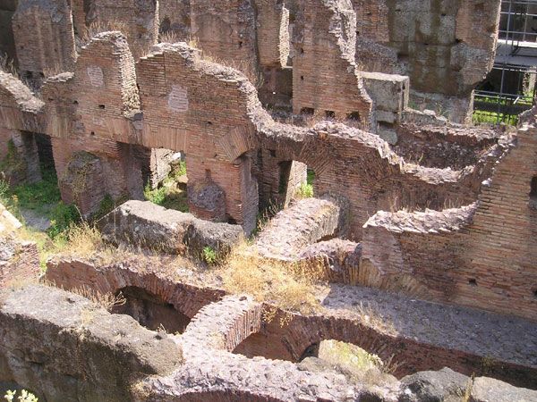 Pohled do středu arény, resp. do prostoru pod arénou, kde byl v 19.století odkryt labyrint podzemních chodeb a místností pro zvířata