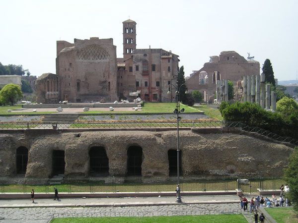 Chrám Venuše a Romy, po pravé straně Mexentiova bazilika - pohled z ochozu Kolosea
