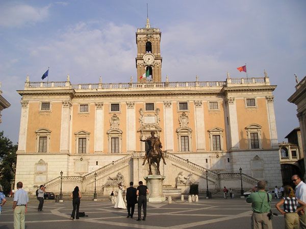 Náměstí Piazza del Campidoglio, navrhnul Michalangelo, v pozadí Palazzo Senatorio