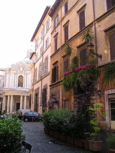Jedna z uliček v okolí Piazza Navona, opryskané domy, ale nádherně obrostlé květinami