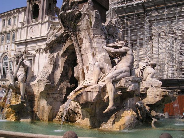 Piazza Navona - Fontana Dei Quattro Fiumi - závoj na soše Nilu zobrazuje tehdy ještě nenalezený pramen Nilu